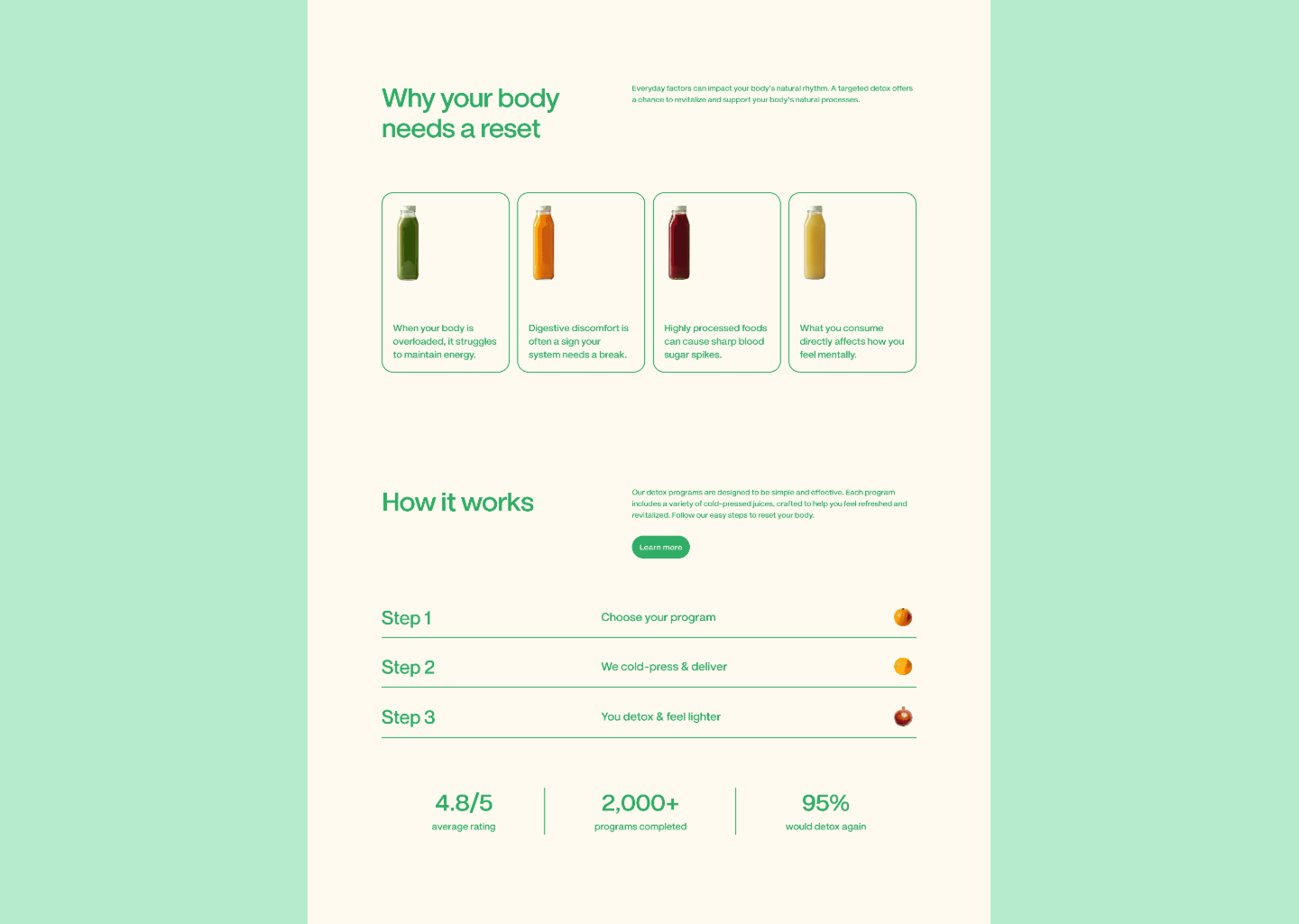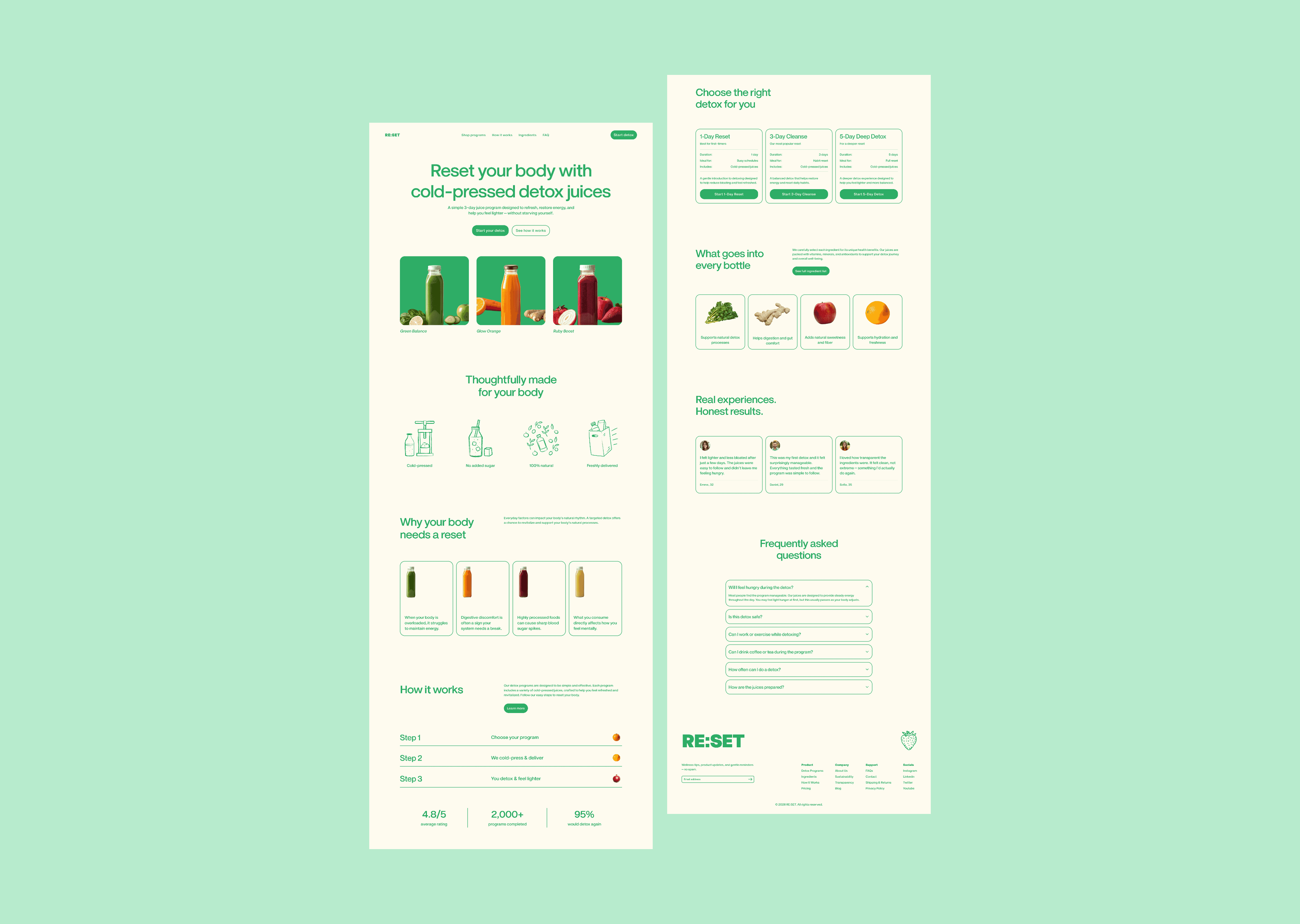 RE:SET is a modern detox juice brand focused on healthy living, balance, and mindful consumption. While the product itself was simple and approachable, the existing digital presence failed to clearly communicate the benefits, ingredients, and detox philosophy in a way that felt both trustworthy and engaging. Users struggled to quickly understand what Reset offers, how the juices work, and which product fits their needs.The challenge was to design a website that delivers information fast and clearly, while expressing RE:SET’s fresh, modern identity through custom illustrations and a clean, intuitive interface.